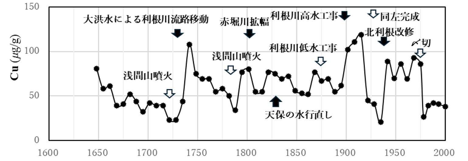 ですから、鉱山から流出した銅が霞ヶ浦の湖底堆積物中に含まれている可能性があります。最深部(玉造沖)の泥を柱状に採取し銅の含有量を測定、堆積速度を3㍉/年とし泥深を時間に変換しました(図1)。図中、銅の値が高い程、利根川の影響が大きかったことを示しています。